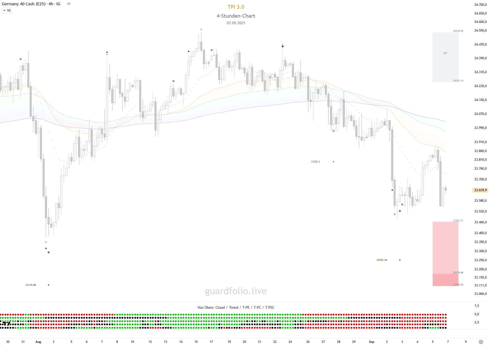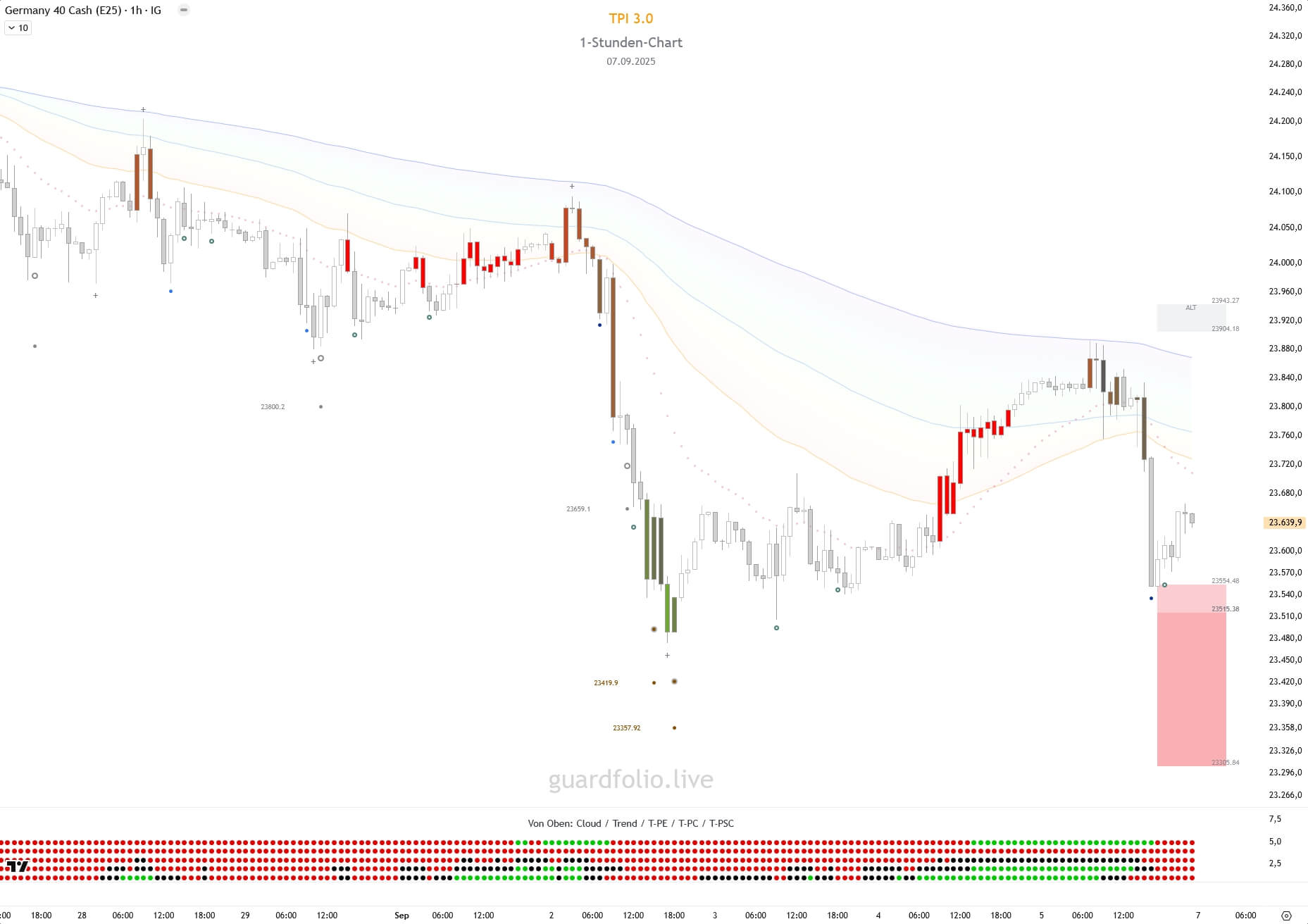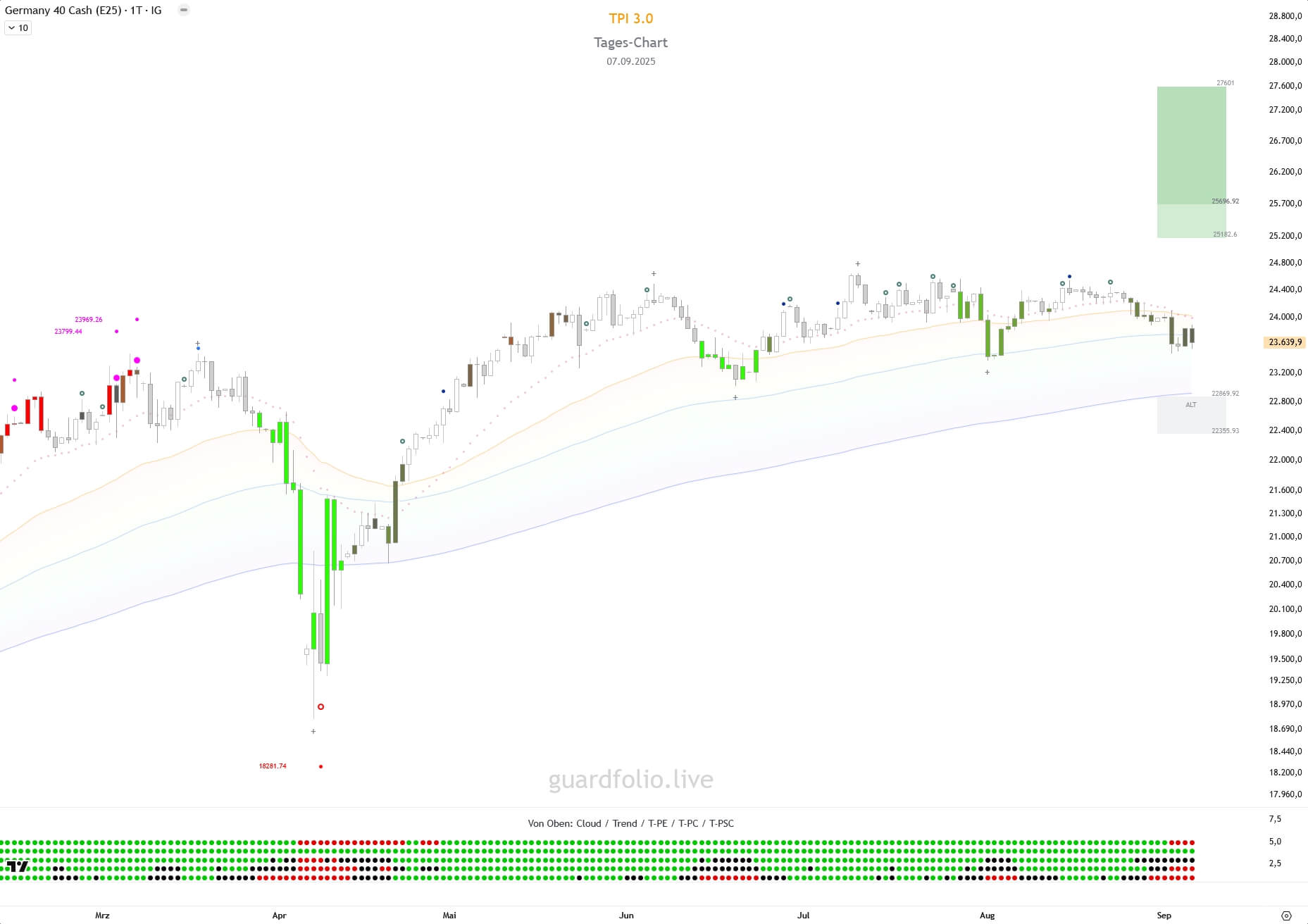 Hier sehen Sie die TPI Indikator Analyse zu Dax. Auf der linken Seite können Sie im Chart die jeweilige aktuelle Marktsituation und deren TPI Signale einsehen und auf der rechten Seite erhalten Sie die dazugehörige Erklärung zu den bereitstehenden TPI Signalen.