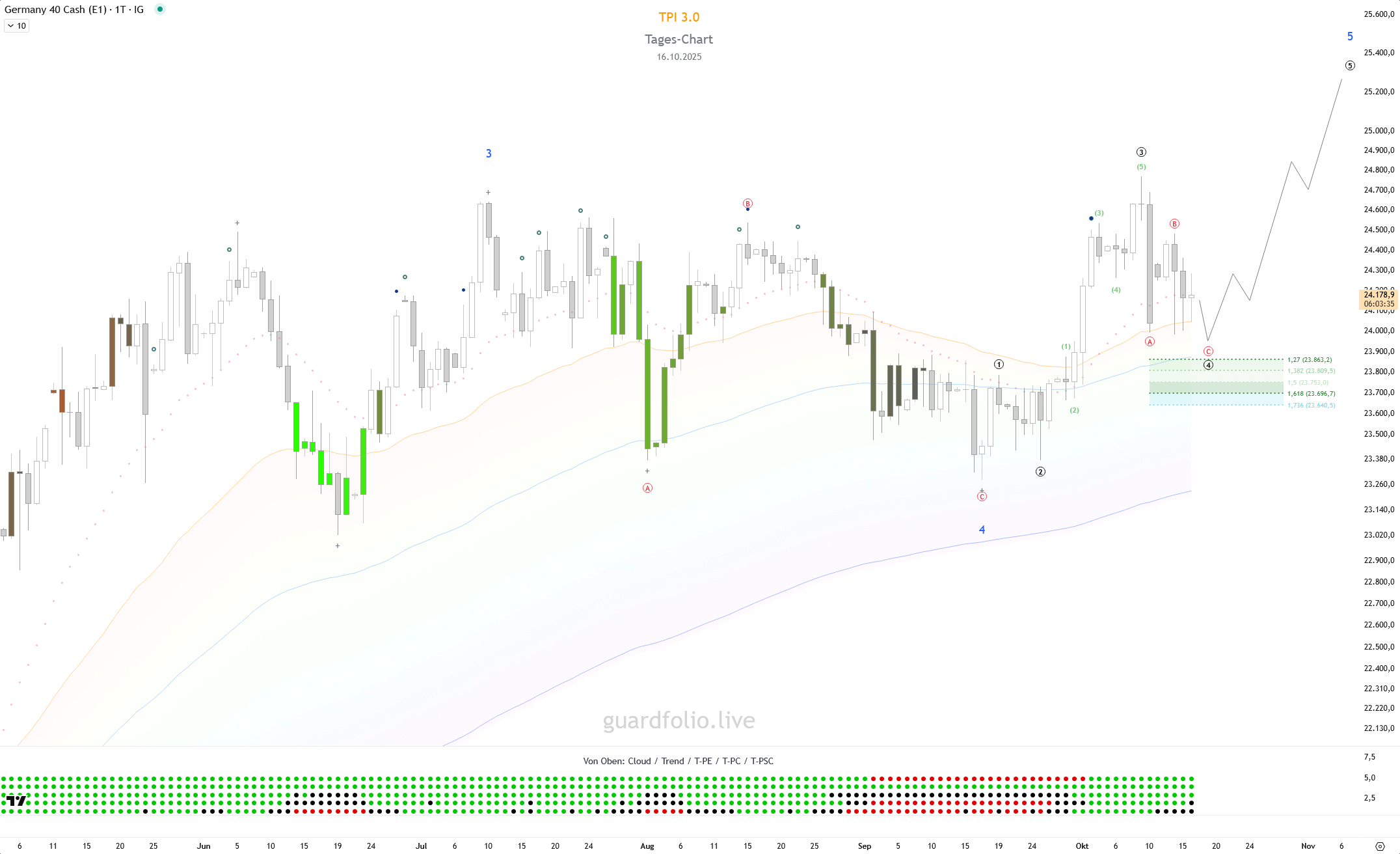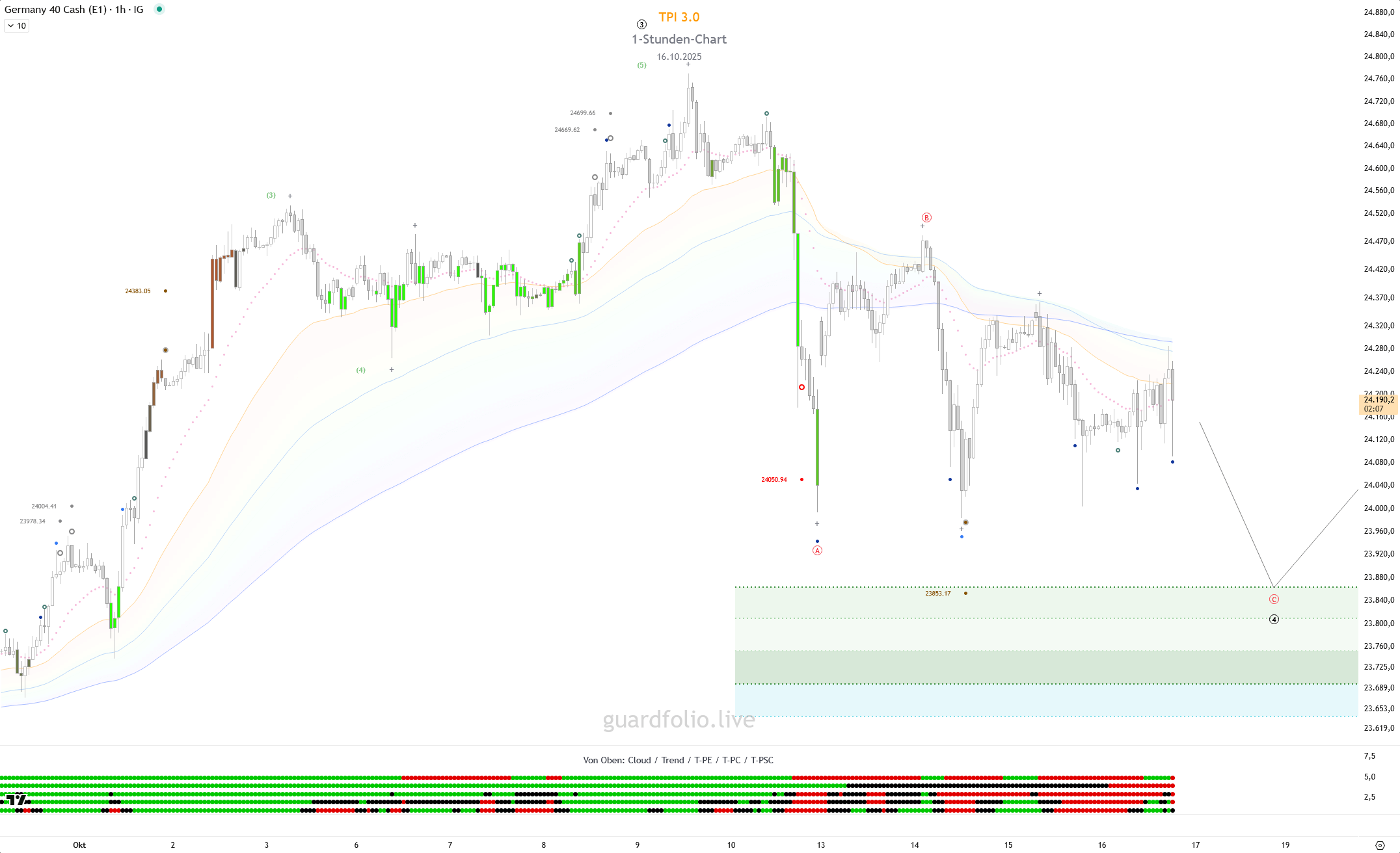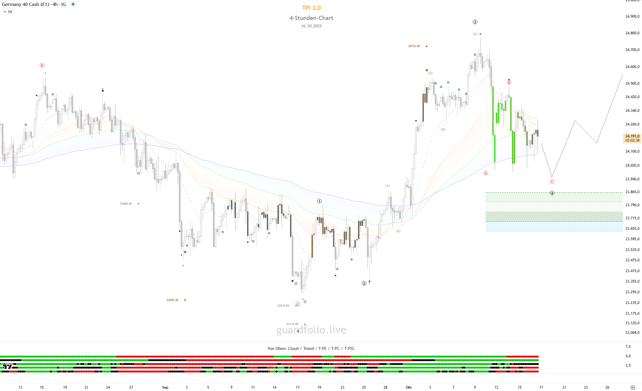 Hier sehen Sie die TPI Indikator Analyse zu Dax. Auf der linken Seite können Sie im Chart die jeweilige aktuelle Marktsituation und deren TPI Signale einsehen und auf der rechten Seite erhalten Sie die dazugehörige Erklärung zu den bereitstehenden TPI Signalen.